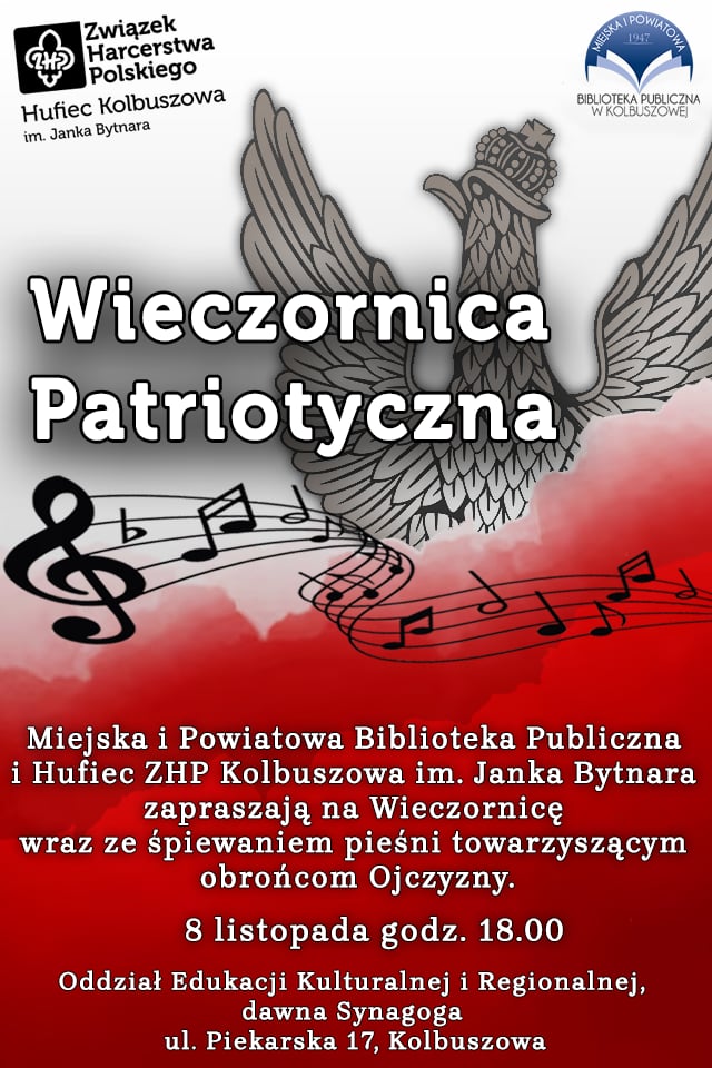 Hufiec ZHP im. Janka Bytnara w Kolbuszowej wraz z Miejską i Powiatową Biblioteką Publiczną w Kolbuszowej serdecznie zapraszają wszystkich mieszkańców, harcerzy i zuchy z rodzinami na Wieczornicę Patriotyczną połączoną ze śpiewem.
