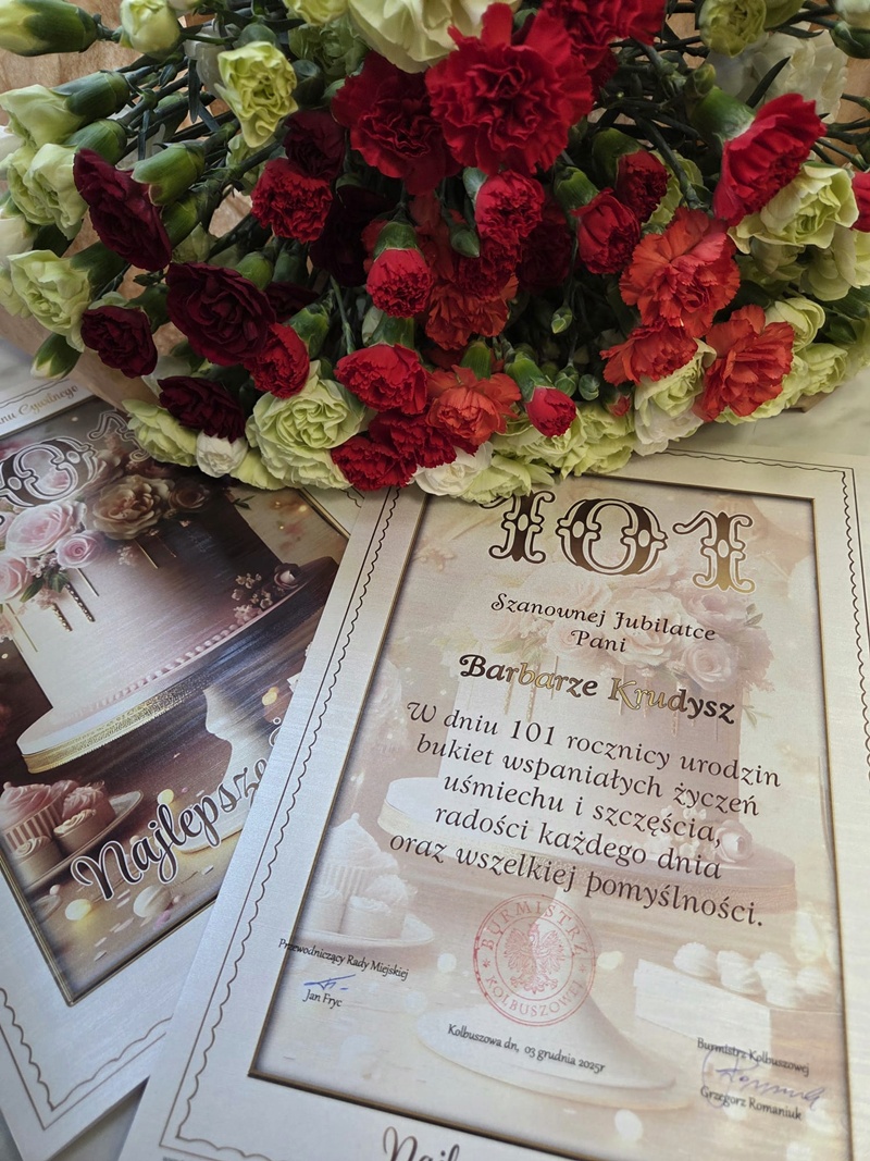 W dniu 3 grudnia br. Pani Barbara Krudysz z Kolbuszowej obchodziła swoje 101. urodziny. Z tej okazji Jubilatkę odwiedzili Zastępca Burmistrza Kolbuszowej Krzysztof Wójcicki oraz Kierownik Urzędu Stanu Cywilnego Ewa Gul-Czachor, składając jej serdeczne życzenia oraz wręczając kwiaty i upominki.