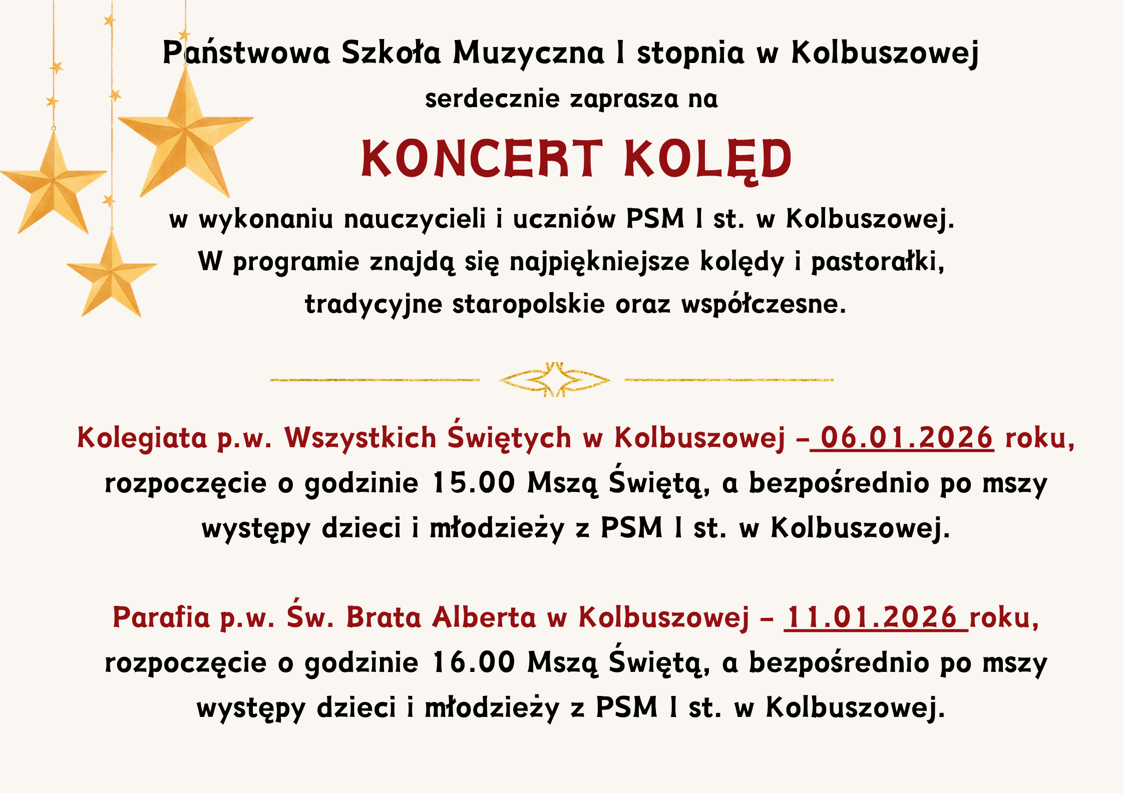 Państwowa Szkoła Muzyczna I stopnia w Kolbuszowej serdecznie zaprasza na koncerty kolęd w kolbuszowskich kościołach.