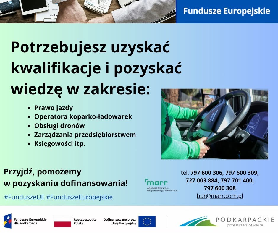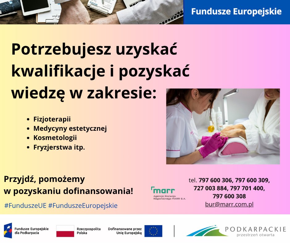Projekt realizowany i współfinansowany ze środków Europejski Fundusz Społeczny Plus w ramach programu regionalnego Fundusze Europejskie dla Podkarpacia 2021-2027, Priorytet 7 FEPK.07 „Kapitał ludzki gotowy do zmian”, działanie FEPK.07.09 „Rozwój kwalifikacji i kompetencji kadr”.