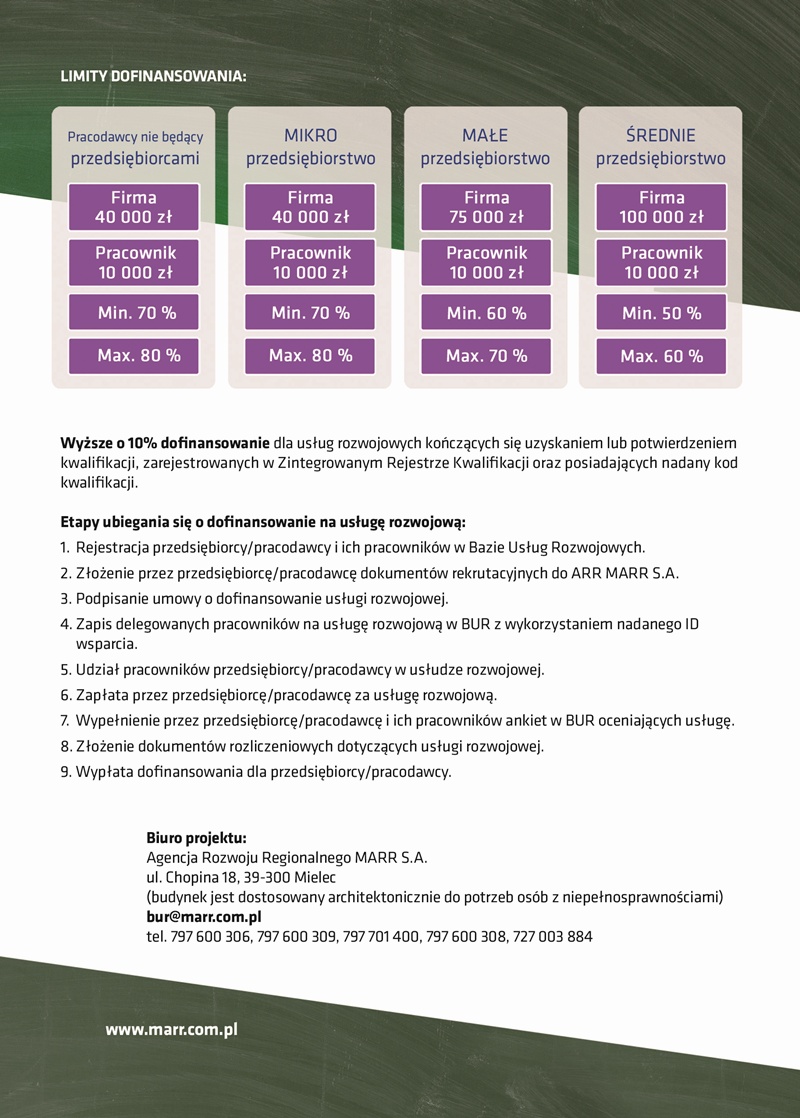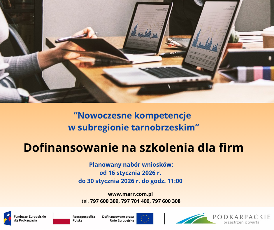 Agencja Rozwoju Regionalnego „MARR S.A.” informuje, że w styczniu rozpoczyna się 10 tura naboru przedsiębiorców do projektu „Nowoczesne kompetencje w subregionie tarnobrzeskim”. W ramach projektu udzielane jest dofinansowanie do organizacji kursów, szkoleń i studiów podyplomowych w firmach dla przedsiębiorców z powiatów: tarnobrzeskiego, mieleckiego, stalowowolskiego, niżańskiego i kolbuszowskiego.