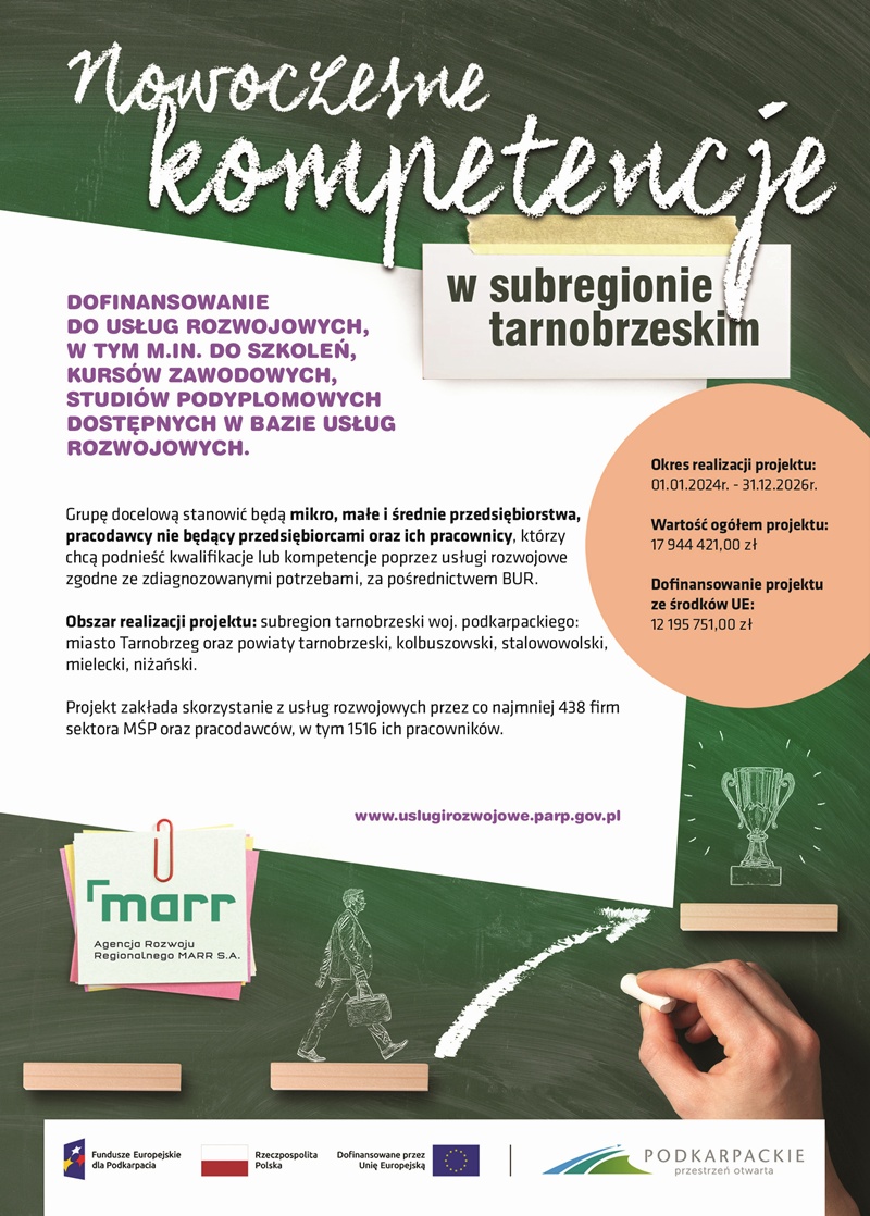 Projekt pt. „Nowoczesne kompetencje w subregionie tarnobrzeskim” realizowany jest przez Agencję Rozwoju Regionalnego MARR S.A. na podstawie umowy nr FEPK.07.09-IP.01-0013/23-00 z dnia 02.11.2023 r. zawartej z Województwem Podkarpackim – Wojewódzkim Urzędem Pracy w Rzeszowie.