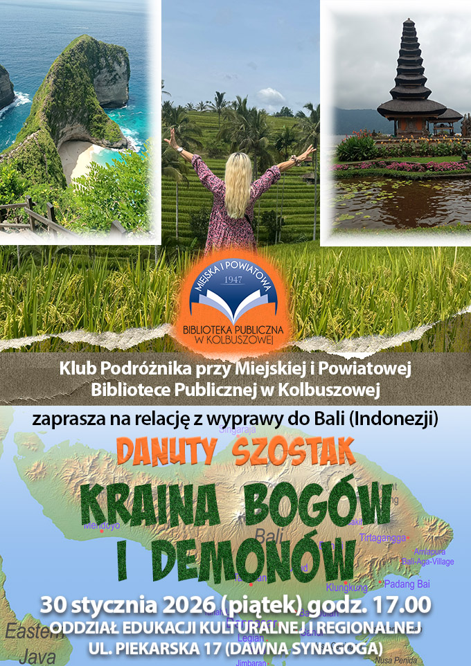 Klub Podróżnika działający przy Miejskiej i Powiatowej Bibliotece Publicznej w Kolbuszowej serdecznie zaprasza na spotkanie z Danutą Szostak, która opowie o podróży na Bali.