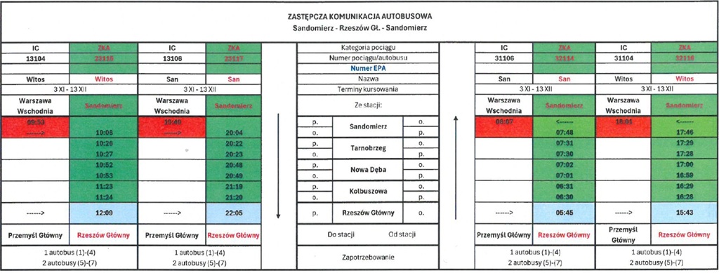 Zastępcza Komunikacja Autobusowa w okresie 03 XI – 13 XII 2025 na odcinku Sandomierz – Rzeszów Główny